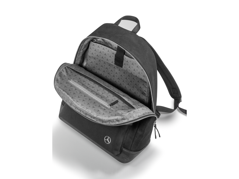 De rugzak maakt indruk met zijn gewatteerde, versterkte rug met gaasinzet en zijn gewatteerde schouderbanden met gemetalliseerde verstellers. Hij biedt niet alleen extra draagcomfort, maar ook veel ruimte voor documenten. Naast een ruim hoofdvak, waar documenten van A4-formaat in passen, is er ook een laptopvak voor apparaten tot 15 inch, twee voorvakken en een ritsvak voor het laptopvak. Het ontwerp wordt gecompleteerd door een binnenvoering met een print van het Mercedes-Benz patroon. De leren applicaties op de rugzak zijn gemaakt van hetzelfde leer dat wordt gebruikt voor de stoelen en accessoires in het elegante interieur van de Mercedes-Benz S-Klasse. In de geest van upcycling wordt het waardevolle leer gebruikt op een manier die hulpbronnen spaart.