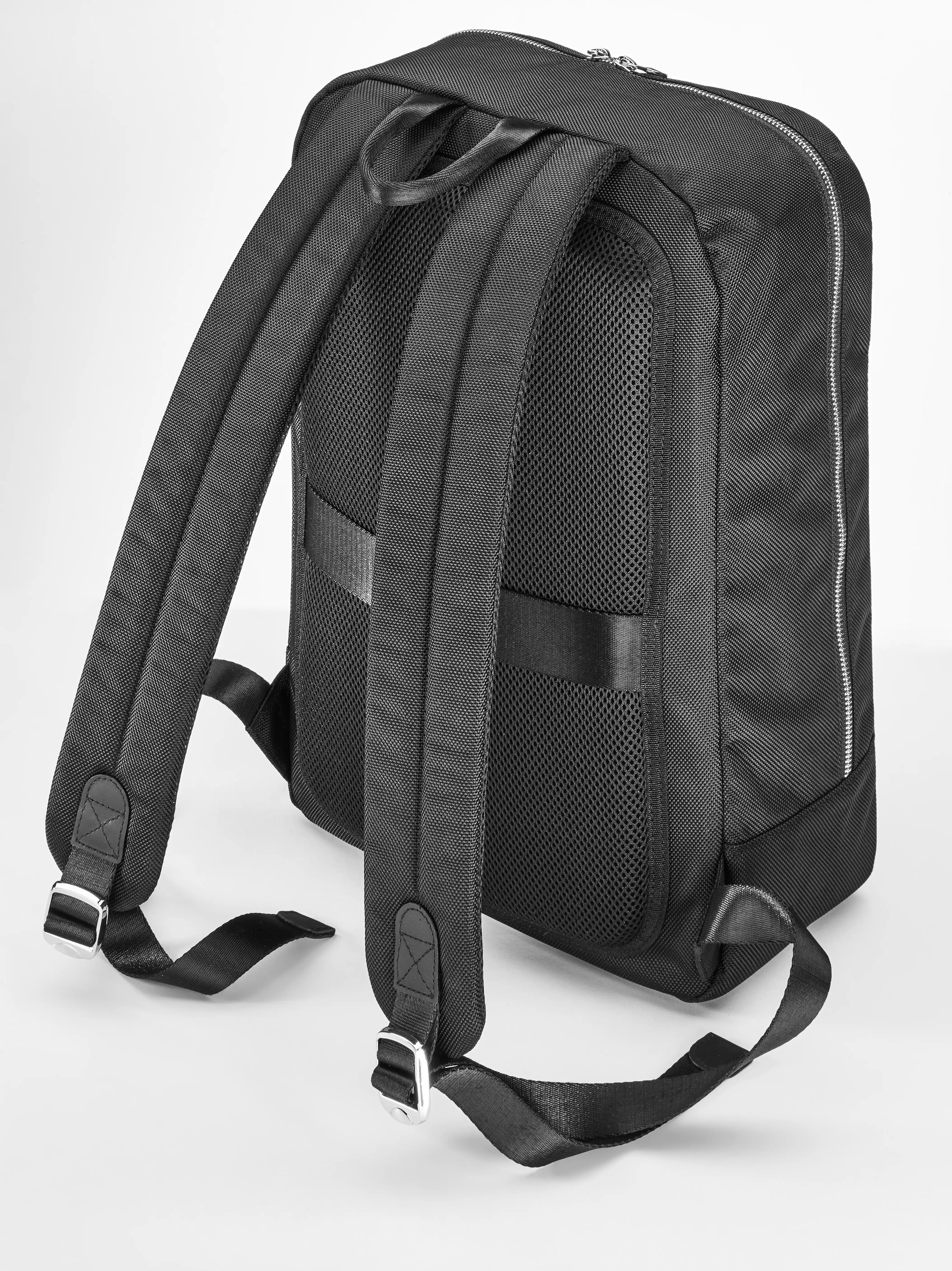Deze zwarte rugzak is de perfecte metgezel, of je nu op reis gaat voor je vrije tijd of naar je werk. Hij biedt een ruim hoofdvak met een tweewegritssluiting, waar ruimte is voor al je benodigdheden. In een speciaal gewatteerd vak met een riem en klittenbandsluiting past een laptop van maximaal 15 inch. Er zijn ook twee pennenhouders en een elastische lus voor gesloten drankflessen. Een bevestigd voorvak biedt nog meer opbergruimte. Extra comfort wordt geboden door het met netweefsel gevoerde rugpand en de schouderbanden, waarvan de lengte kan worden aangepast met de metalen verstellers. Met een extra riem aan de achterkant kan de tas aan een telescoopstang worden bevestigd. De zilverkleurige ritsen en 3D-sterretjes contrasteren mooi met de zwarte nylon stof. Opvallende merkopdrukken geven de rugzak een exclusief tintje. De badge met logo en andere lederen applicaties zijn gemaakt van hetzelfde leer dat wordt gebruikt voor de stoelen en bekleding van het elegante interieur van de Mercedes-Benz S-Klasse. Dit is een mooi voorbeeld van upcycling, waarbij waardevol leer wordt hergebruikt op een manier die hulpbronnen spaart.
