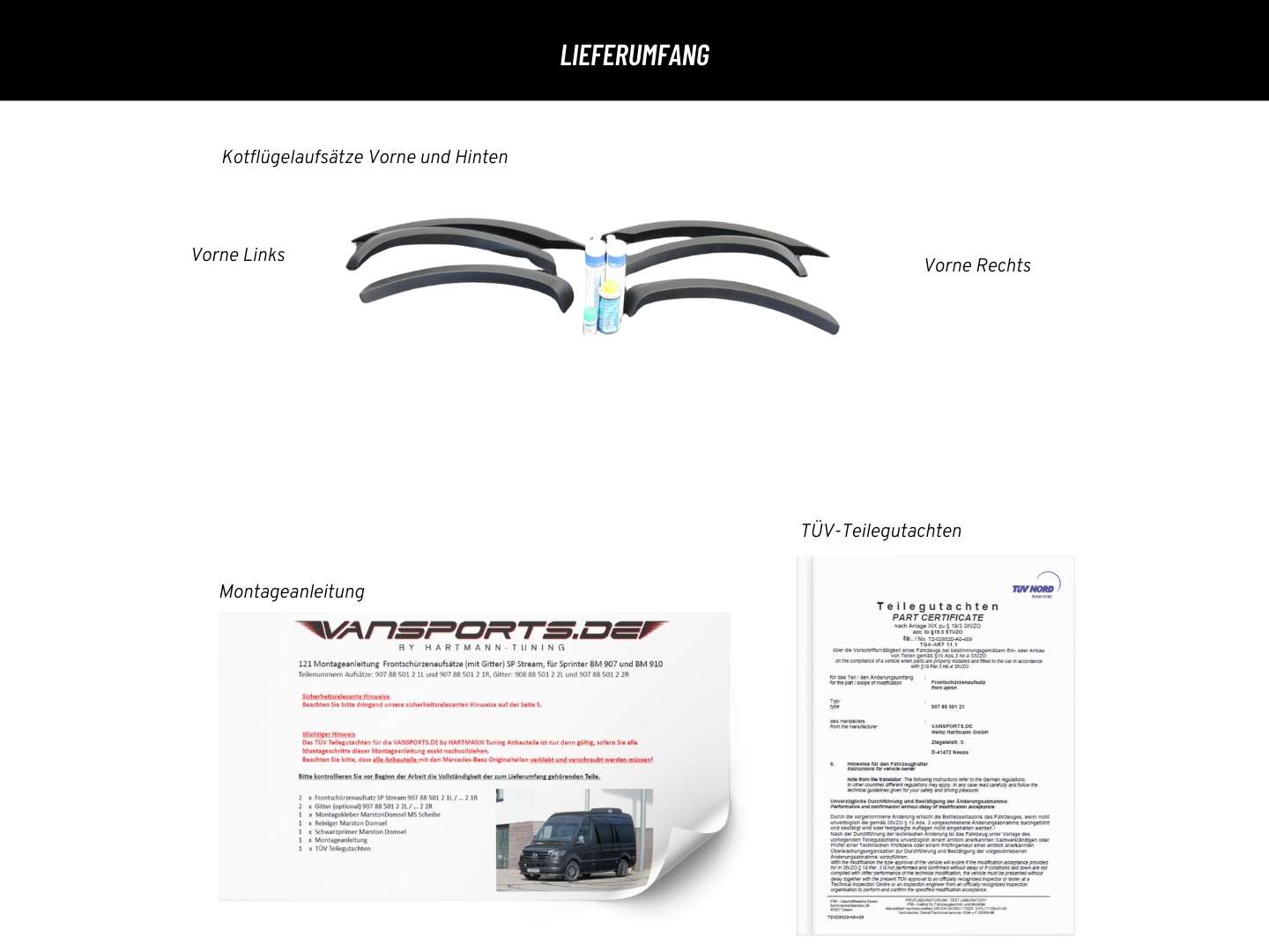 De huidige levertijd is ongeveer 2 weken. Bescherming tegen steenslag en takken Deze 6-delige wielkastenset is speciaal ontworpen voor de Mercedes-Benz Sprinter (modelserie 907). Hij is ideaal voor semi-geïntegreerde voertuigen zoals campers. De precies passende PU-aanbouwdelen in fabriekskwaliteit worden direct op de wielkasten/spatborden van de Sprinter gemonteerd. Er zijn geen spuitkosten omdat de wielkastverbreders worden geleverd met een "zwarte structuur" afwerking. De vooras wordt ongeveer 25 mm breder. Montage is eenvoudig door middel van lijmen en duurt ongeveer 1 uur. De levering omvat het montagemateriaal en de montagehandleiding. Er wordt ook een onderdelencertificaat voor de Sprinter (model 907) meegeleverd. Houd er rekening mee dat een individuele TÜV-goedkeuring vereist kan zijn voor een semi-geïntegreerd voertuig.