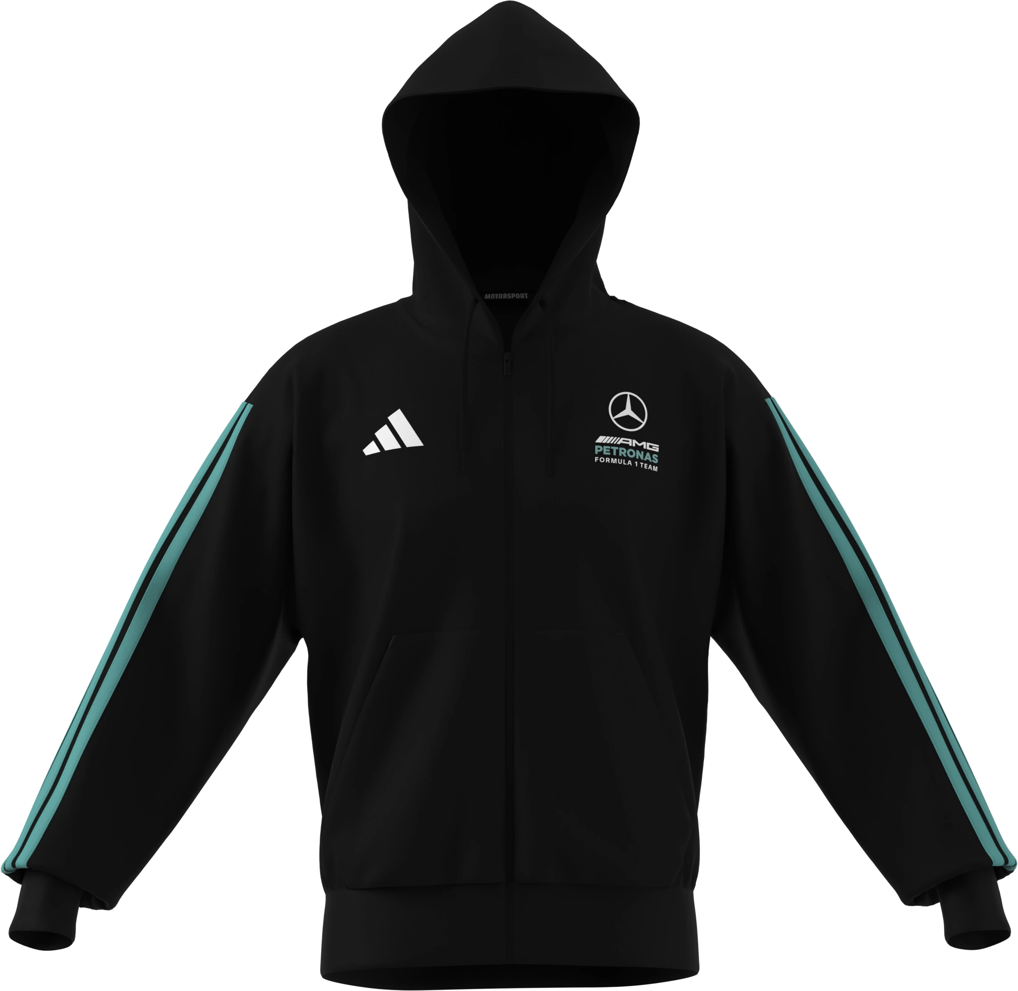 Sportlichkeit trifft Komfort: Die schwarze Sweatjacke ist die ideale Wahl für alle, die auch fernab der Strecke zeigen möchten, für wen das Rennsportherz schlägt. Dabei wird das schlichte Design der klassischen Fanwear von einem Streifendetail am Ärmel aufgelockert. Ein Mercedes-AMG PETRONAS Formula One Team Logo sowie ein adidas Logo machen den Look komplett und setzen zusätzliche Akzente.