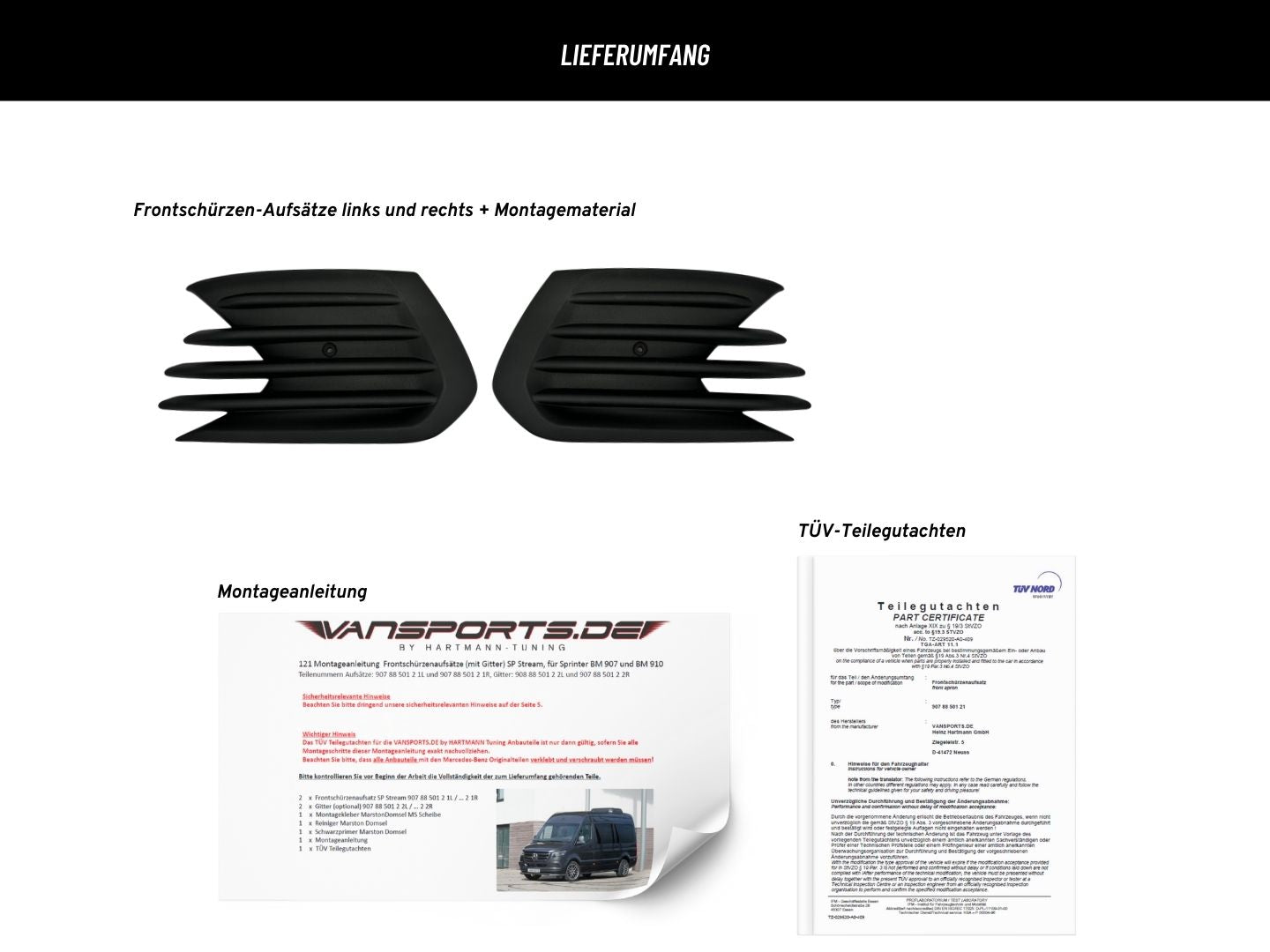 Materiaal: Hoogwaardig PU-randmateriaal Bevestiging: Installatie door lijmen en schroeven op de originele voorschort Certificering: Registratie met TÜV-onderdelencertificaat Leveringsomvang: hulpstukken voor de linker- en rechtervoorschort, TÜV-onderdelencertificaat en montagetoebehoren Niet geschikt voor: Voertuigen met AMG-Line-uitrusting