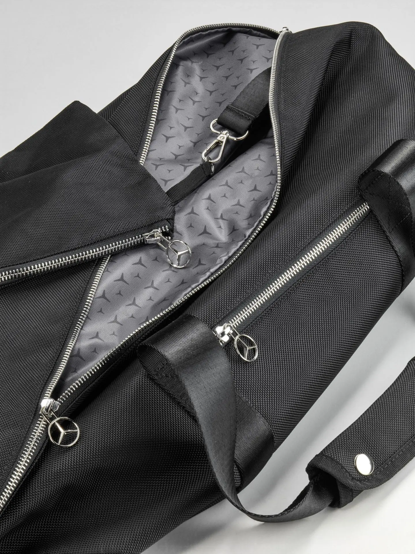 De zwarte weekender is de ideale keuze voor korte uitstapjes of weekenden. Hij heeft een ruim hoofdvak dat sluit met een tweewegritssluiting. Hij heeft ook een uitneembaar binnenvak, dat ook apart kan worden opgehangen dankzij een lus. Een buitenvak bevindt zich tussen de handgrepen en biedt snelle toegang tot veelgebruikte spullen. Het volume van de tas kan ook naar wens worden verkleind of vergroot met de drukknopen aan de zijkant. De zilverkleurige ritsen en 3D sterritstrekkers contrasteren mooi met de zwarte nylon stof. De verstelbare schouderriem met padding zorgt voor meer draagcomfort. Een bijzonder detail is de opvallende branding, die de weekender een exclusieve touch geeft. Zowel de badge met het logo als de andere lederen applicaties op de weekendtas zijn gemaakt van hetzelfde leder dat wordt gebruikt voor de stoelen en accessoires in het elegante interieur van de Mercedes-Benz S-Klasse. In de geest van upcycling wordt het waardevolle leer gebruikt op een manier die hulpbronnen spaart.