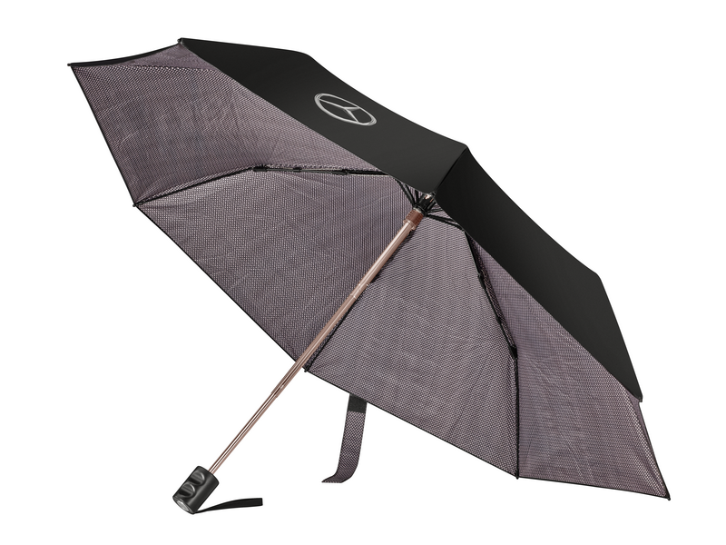 Laat je nooit meer overvallen door de regen: Met onze modieuze zakparaplu, die ingeklapt slechts 27 cm meet, ben je altijd voorbereid op slecht weer. De paraplu past in de meeste tassen en maakt indruk met zijn geraffineerde ontwerp. Geïnspireerd door de patronen op de autostoelen van de EQA- en EQB-modellen, zijn de voering en sluitband bedrukt. Het handvat, de stangen, de bovenkant en de uiteinden zijn in een elegante matzwarte kleur. Het roségoud van het stokje, dat doet denken aan de lakkleur van de eerder genoemde modellen, maakt de paraplu tot een echte blikvanger. Een Mercedes sterrenprint op het deksel en een 3D sterrenbadge in zilver op het handvat ronden het design van de handige zakparaplu af. Productgegevens: - Kleur: zwart/roze goud - Hoes: 100% gerecycled polyester - Handvat: gerecycled plastic - Stalen paal - Rails gemaakt van metaal en glasvezel - Diameter in geopende stand: ca. 98 cm - Lengte in gesloten toestand: ca. 27 cm - Handopener - Ontwerp geïnspireerd op de EQA- en EQB-modellen