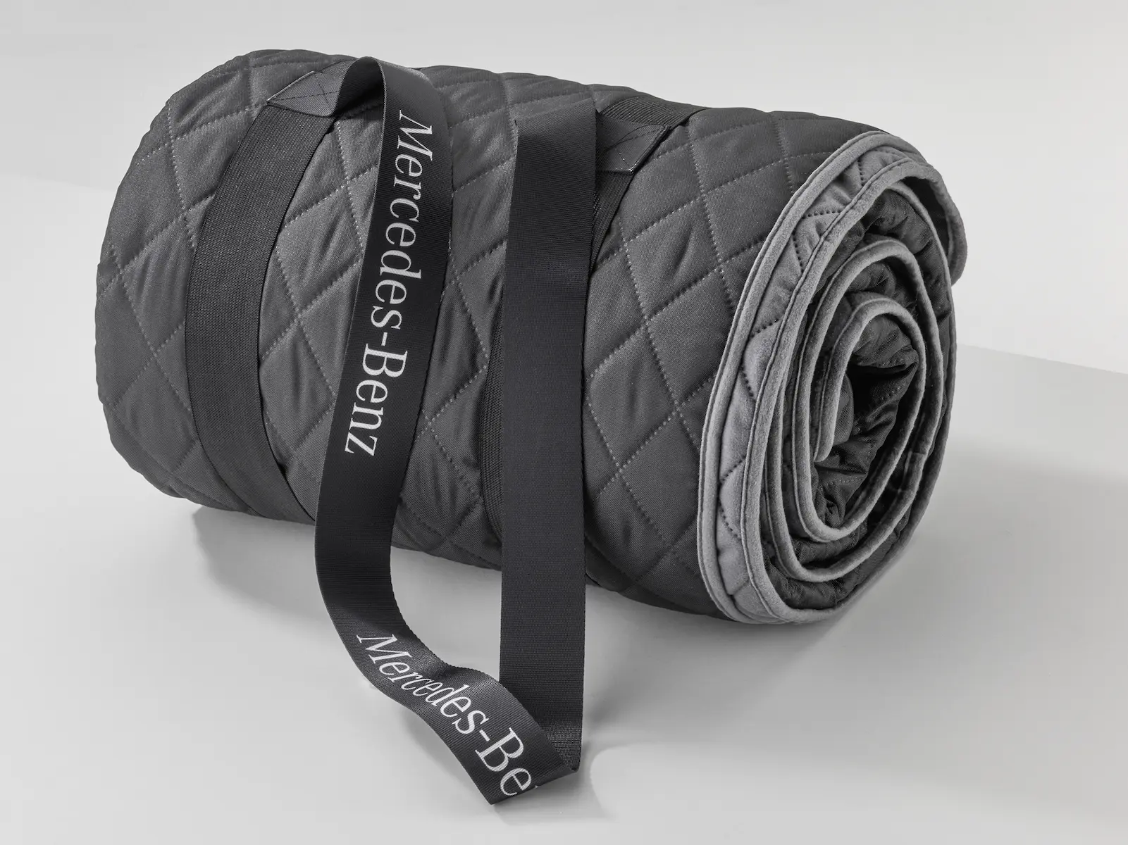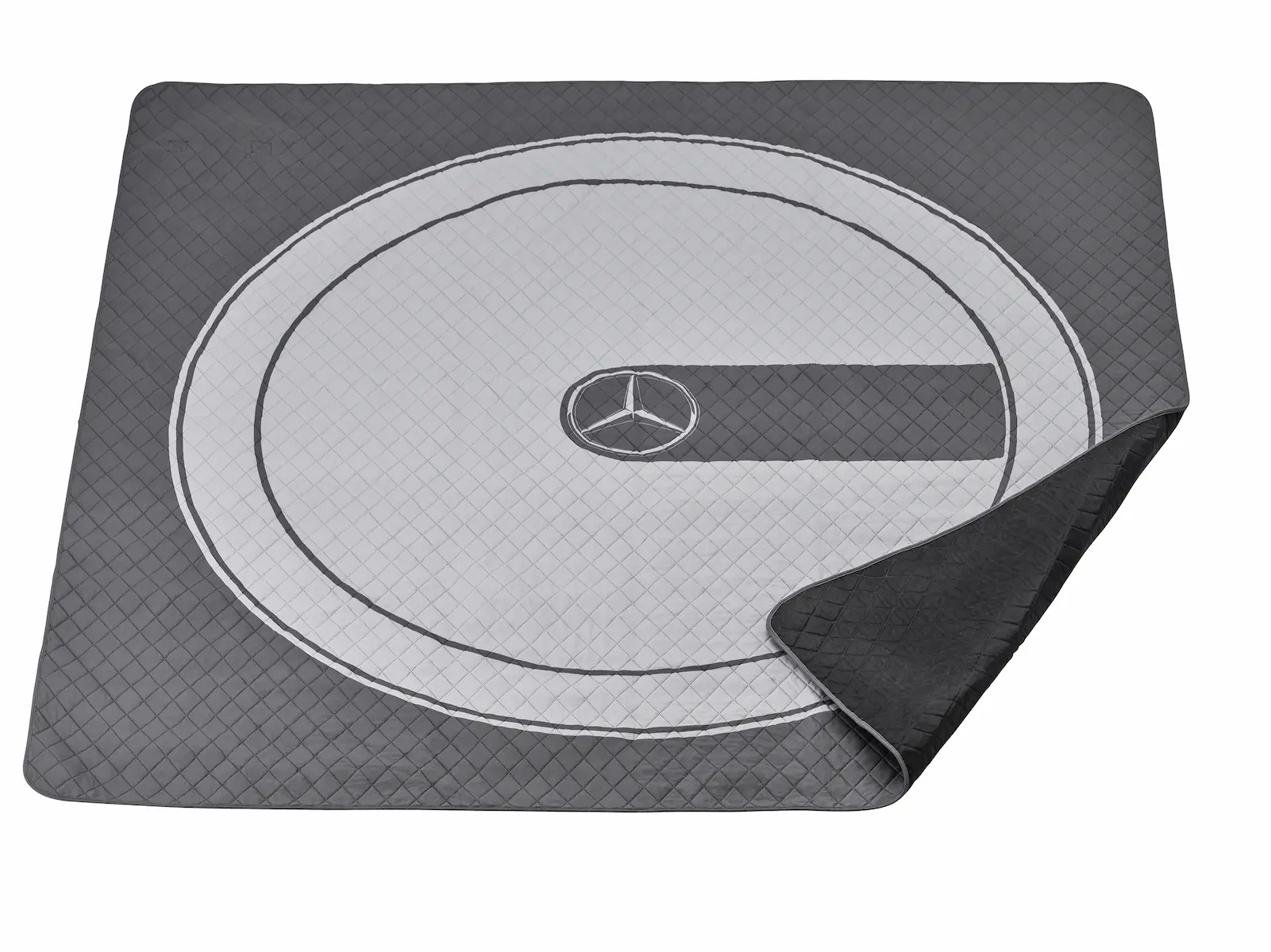 Genießen Sie gemütliche Momente im Freien mit dieser Picknickdecke in Titangrau und Hellgrau. Die dreilagige Decke bietet Komfort durch eine weiche Oberseite aus Polyesterfleece, eine wasserabweisende Unterseite und eine flauschige Füllung, die durch ein Thermostitching miteinander verbunden sind. Zwei Gummibänder und Trageriemen mit Mercedes-Benz Schriftzug an der Unterseite ermöglichen es Ihnen, die Decke im zusammengerollten Zustand zu fixieren, leicht zu transportieren und platzsparend zu verstauen. Ein gedrucktes Motiv, das an das Ersatzradgehäuse der G-Klasse erinnert, verleiht der Picknickdecke ihren eleganten und sportlichen Look.