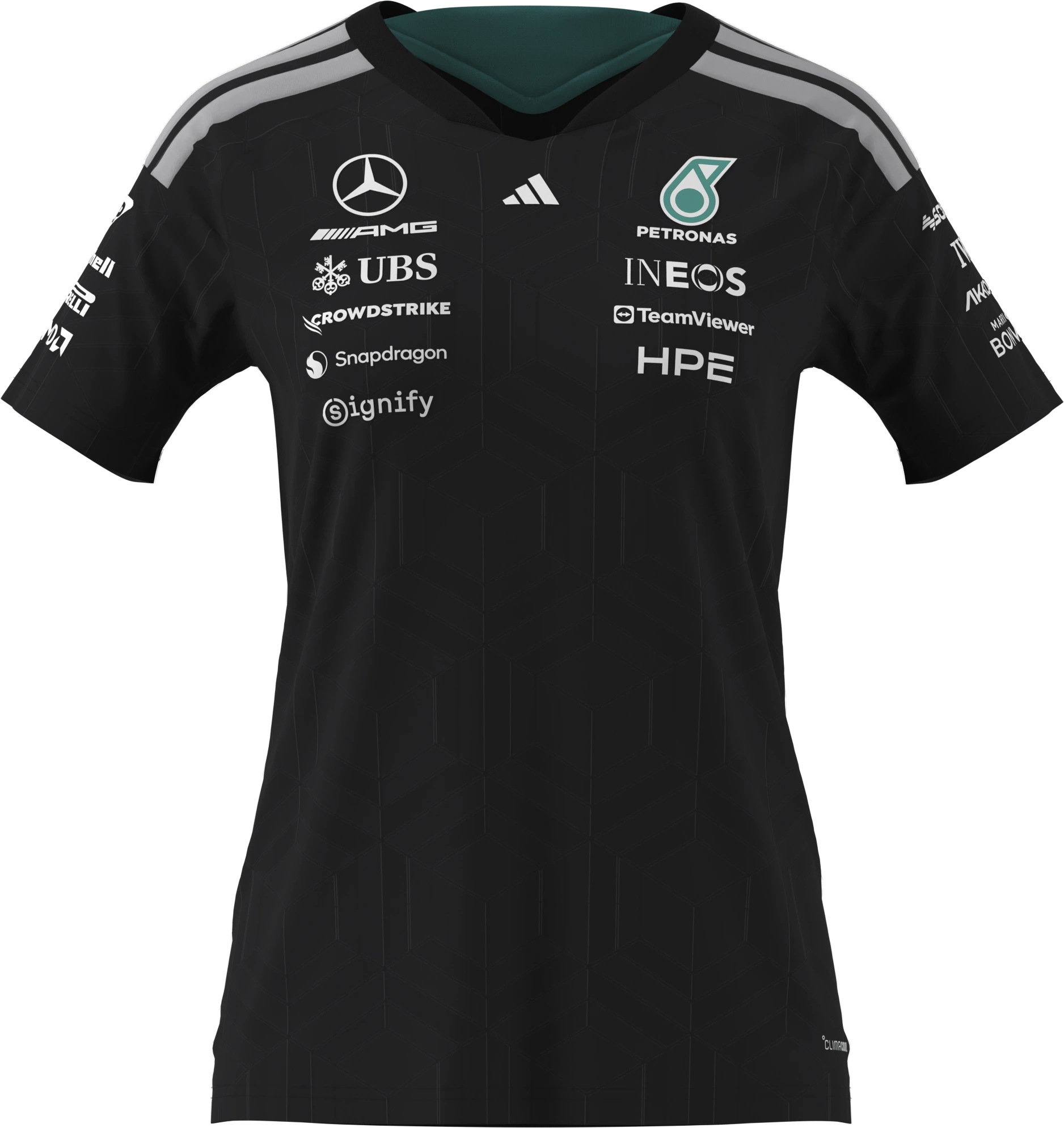 Ein klarer, stilisierter Look, inspiriert vom Mercedes-AMG PETRONAS Formula One Team: Das Damen-Shirt lässt auf den ersten Blick erkennen, für wen das Rennsportherz schlägt. Ein Streifendetail an der Schulter akzentuiert das elegante T-Shirt, während Team- und Partnerlogos auf der Vorder- und Rückseite sowie auf den Ärmeln das Design komplettieren. Eine perfekte Mischung aus Stil und Performance!
