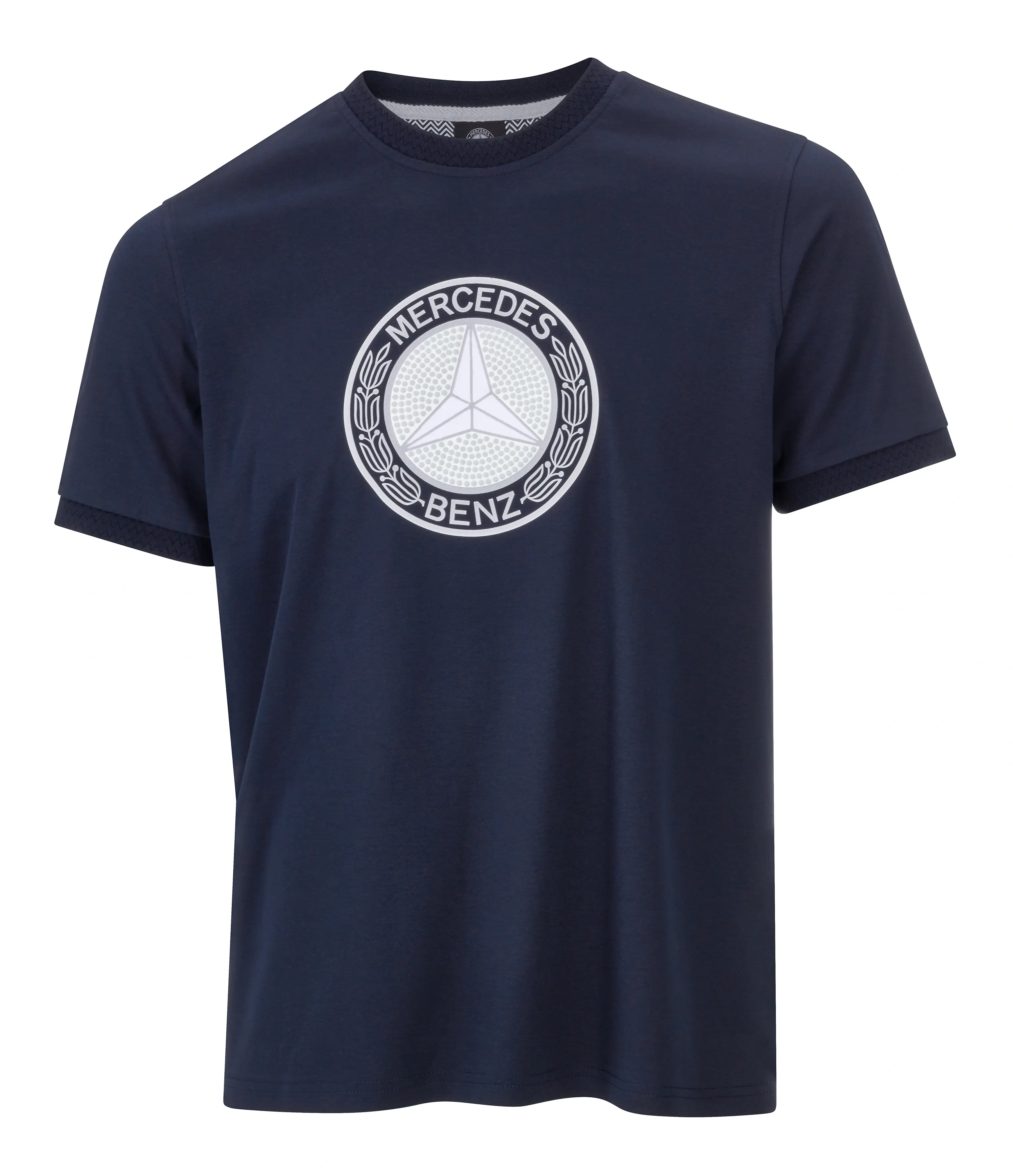 Das T-Shirt aus reiner Bio-Baumwolle vereint angenehmen Tragekomfort und modisches Design auf gekonnte Art und Weise. In bequemer Modern-Fit-Passform präsentiert sich das Shirt, dessen Look von einem Rundhalsausschnitt und Ärmelbündchen mit Zickzack-Einstrickmuster, einem bedruckten Nackenspiegel mit Zickzack-Muster sowie einem strukturierten Nackenband komplettiert wird. Ein historischer Stern-Druck im Brustbereich setzt einen zusätzlichen Akzent und macht das Shirt zu einem echten Must-have für Mercedes-Benz-Liebhaber.