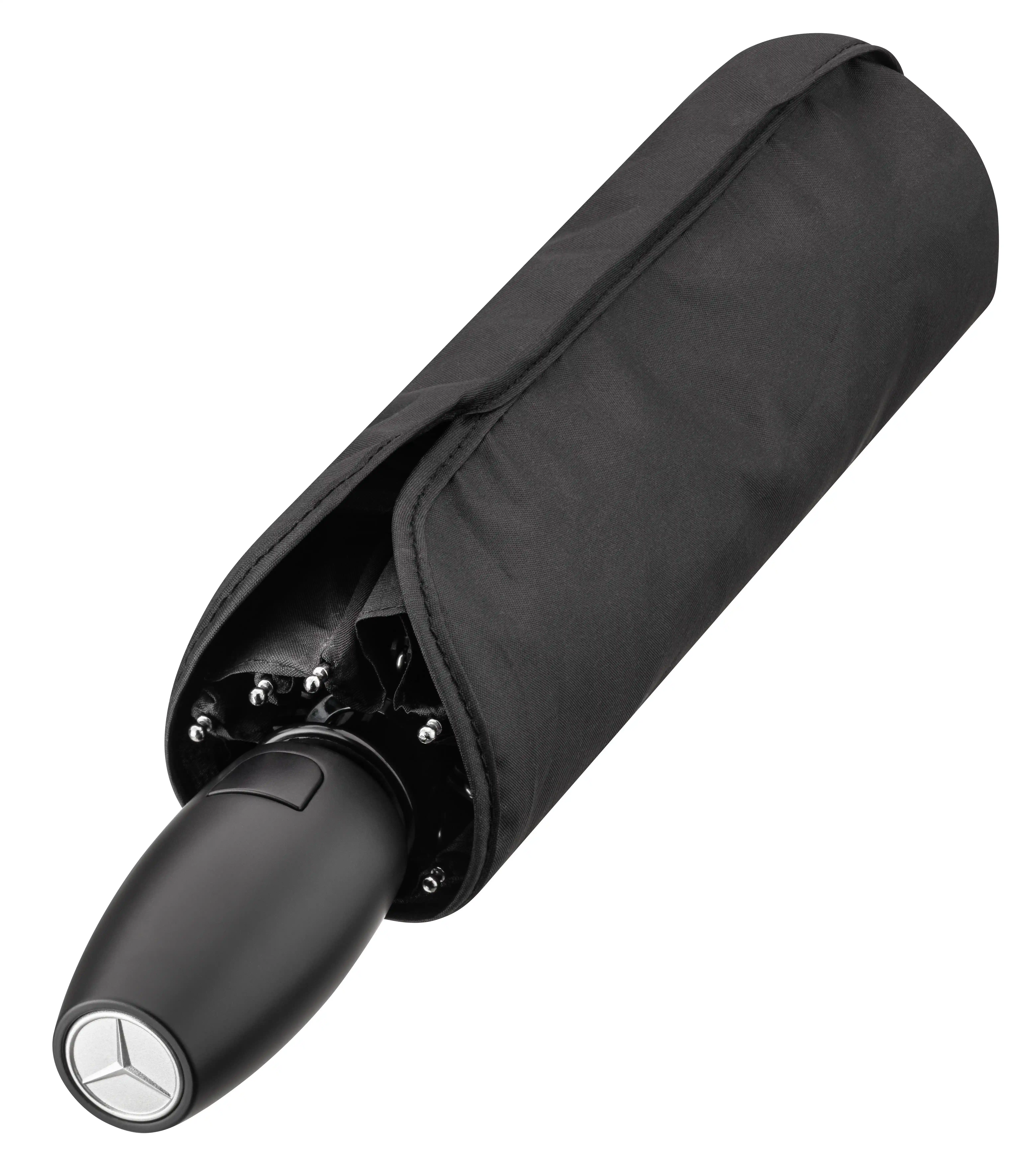 Passt in fast jede Tasche: der praktische Doppelautomatik-Taschenschirm mit passendem Futteral. Der schwarze Schirm mit verchromtem Stahlstock und einem weißen Mercedes Stern-Druck präsentiert sich als „Windproof“-Ausführung. Der mit einer schwarzen Auslösetaste versehene 8-teilige Schirm liegt dank des Kunststoffgriffs in ikonischem Design mit eingelegter silberfarbener 3D-Sternplakette sicher in der Hand. Eine schwarze elastische Trageschlaufe rundet die Ausstattung ab.